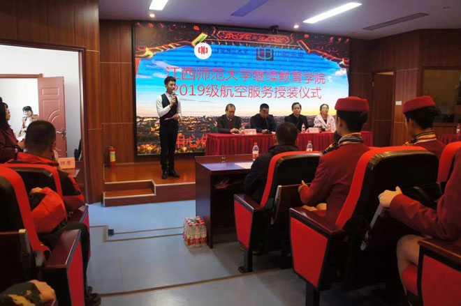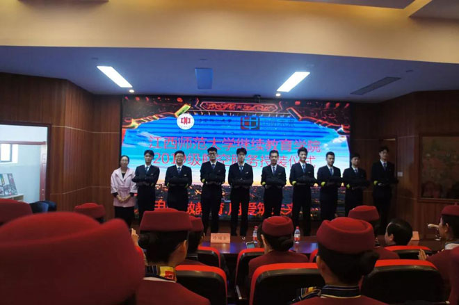 2019年11月21日下午2点30分,江西师范大学继续教育学院航空服务专业在成教大楼603隆重举行19级学员制服授装仪式。本次活动主要是为了让学生感受到制服对于职业的必要性和专业性,当学生穿上航空制服的那刻,是神圣的,他们必须具备一个民航人的责任感和敬畏感,敬畏生命,敬畏责任,敬畏规章。